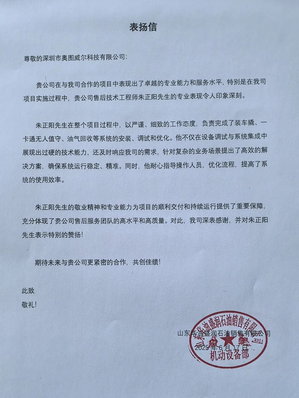 近日,深圳市奥图威尔科技有限公司(以下简称“深奥图”)售后技术部工程师朱正阳收到淄博鑫泰石化有限公司和山东华油盛润石油销售有限公司发来的正式表扬信,对其在项目中的卓越表现给予高度评价。这不仅是客户对朱正阳个人能力的认可,更是对深奥图服务理念的充分肯定。